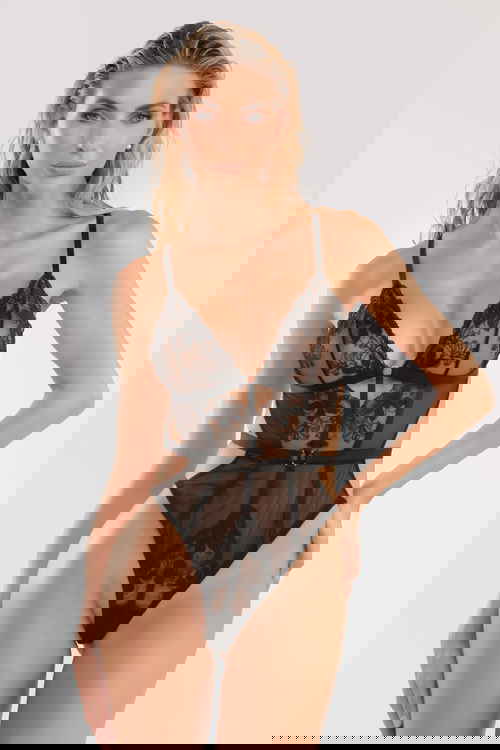 • Kosár drót nélkül • Necc anyag virágos csipkével • Nem bélelt • Állítható vállpánt • Elasztikus hátsó pánt • Öv a testhez való illeszkedéshez • Átlátszó • 87% nylon, 13% spandex