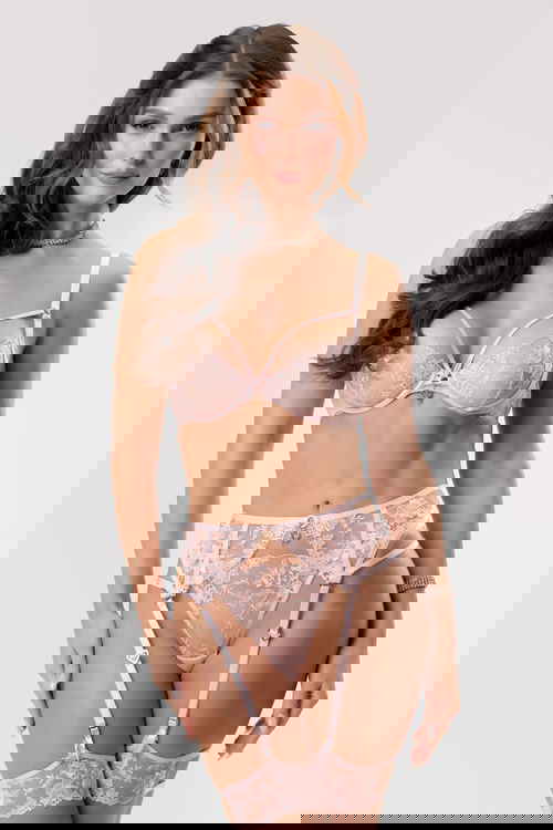 • Košarica z žično oporo • Nepodložen • Nastavljive naramnice • Tangice z normalnim pasom • Bombažni vstavek • Pašček z držki za nogavice ali garter • Priložen garter • 76% poliester, 24% poliamid