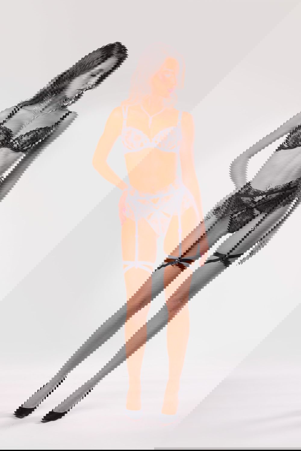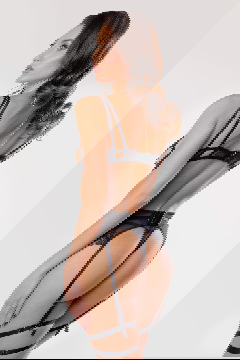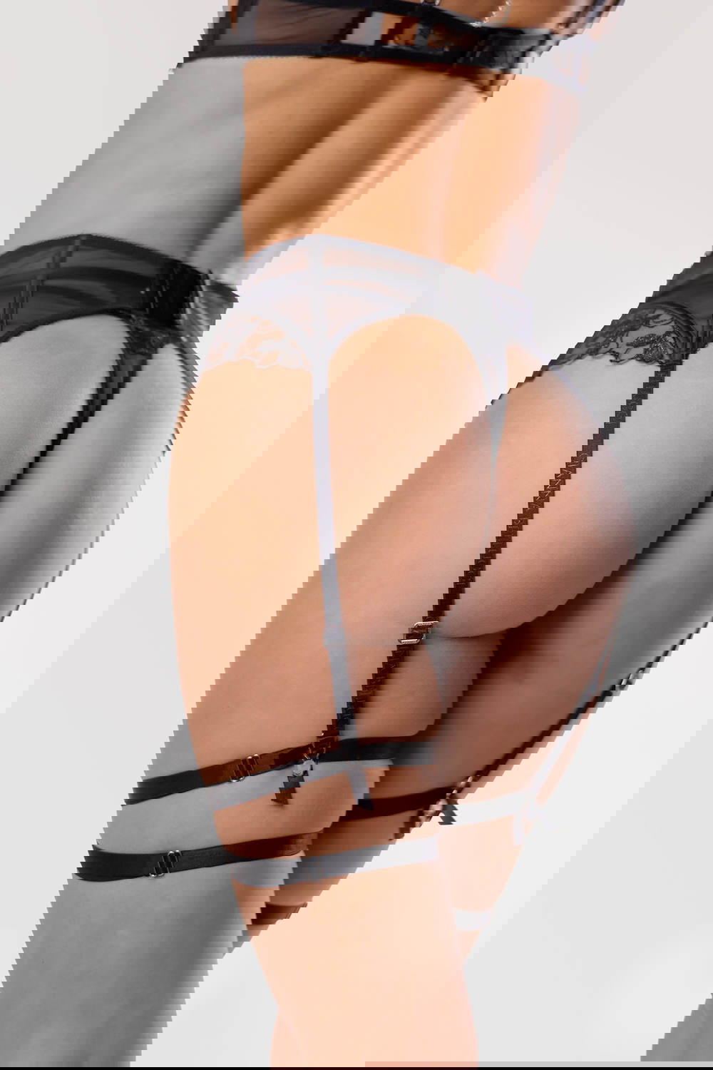 • Basket with wire support • Not subject • Adjustable shoulder straps • Thong bikini with normal waist • Cotton insert • Pašček z držki za nogavice ali garter • Priložen garter • 81% poliamid, 19% elastan